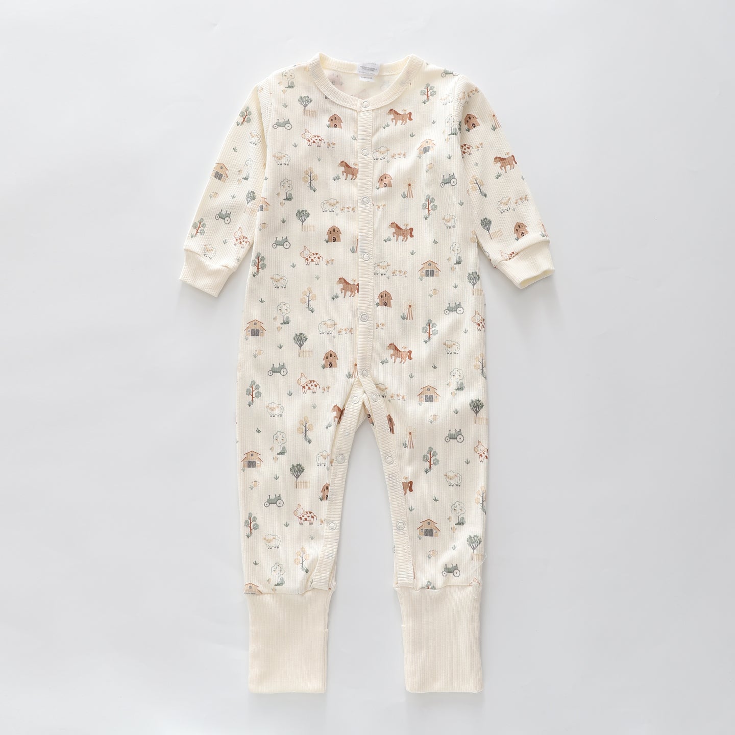 Perfect for all day comfort, our Farm Animals Romper is lightweight and breathable. Made with a ribbed cotton, this adorable bodysuit features fold over enclosed feet and a beautifully neutral farm animals print. With a full length snap button opening, this onesie is perfect for go slow days.